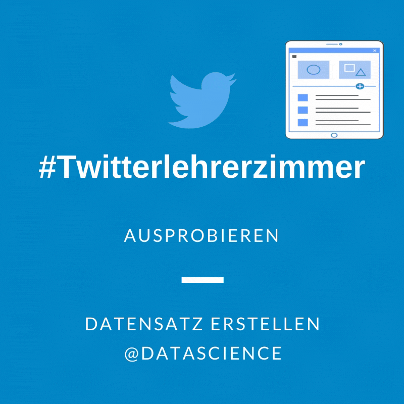 Sie arbeiten sich in die Twitter-API mit Python ein. Sie bekommen die Möglichkeit für den Hashtag #Twitterlehrerzimmer die Daten zu sammeln und mit bestehenden Machine Learning-Techniken auszuprobieren (z.B. https://scikit-learn.org/stable/). Sie dürfen verschiedenste Tutorials ausprobieren und das Ziel sollte ein beschriebener Datensatz sein an dem sie in Abstimmung verschiedene Auswertungsmöglichkeiten testen.